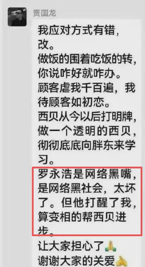 此外,罗永浩还发文表示:“贾国龙,那这件事我们没法揭过去了。在中间再劝我的朋友,我们一律绝交吧。”