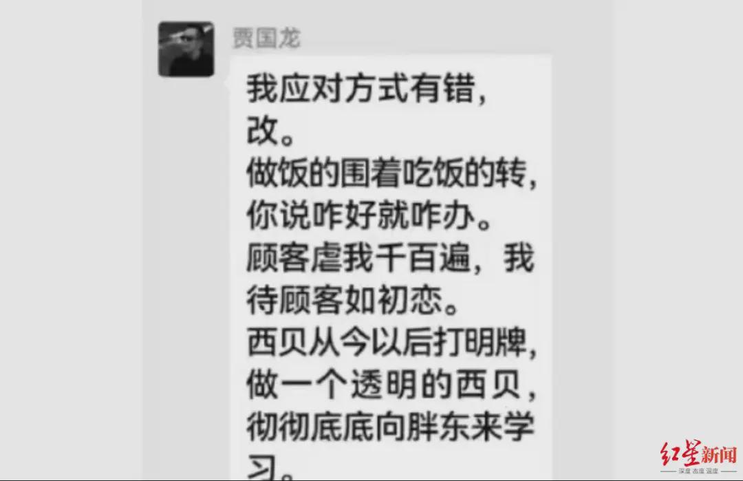 贾国龙表示“我应对方式有错,改。做饭的围着吃饭的转,你说咋好就咋办。”贾国龙称,西贝今后将“打明牌”,做一个透明的西贝,彻底向学习。红星资本局从相关人士处了解到,截图属实。