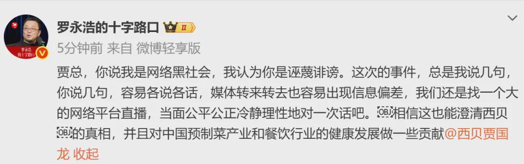 随后,罗永浩继续发文:这次的事件,总是我说几句,你说几句,容易各说各话,媒体转来转去也容易出现信息偏差,我们还是找一个大的网络平台直播,当面公平公正冷静理性地对一次话吧。相信这也能澄清西贝的真相,并且对中国预制菜产业和餐饮行业的健康发展做一些贡献。