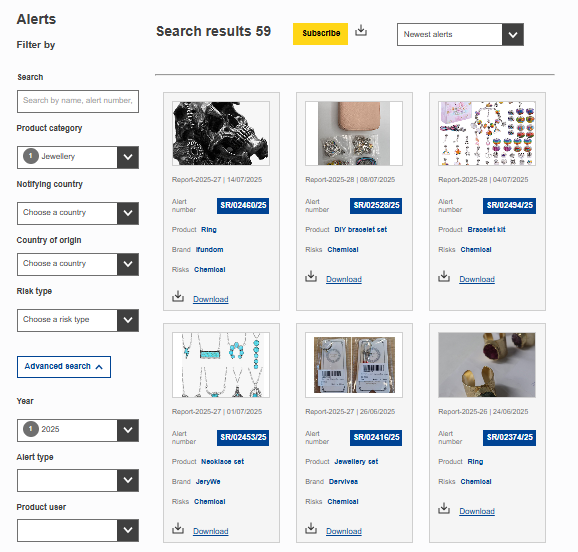 饰品中有害元素超标的现象也并非个例。以“欧盟危险非食品产品快速预警系统”披露的信息为例,2025年开年以来,欧盟已发布59则首饰召回信息,涉及风险多为镉含量、镍释放量超标。不合格产品中相当一部分是耳饰,它们长期与皮肤接触,并可能在穿孔伤口愈合过程中使用。