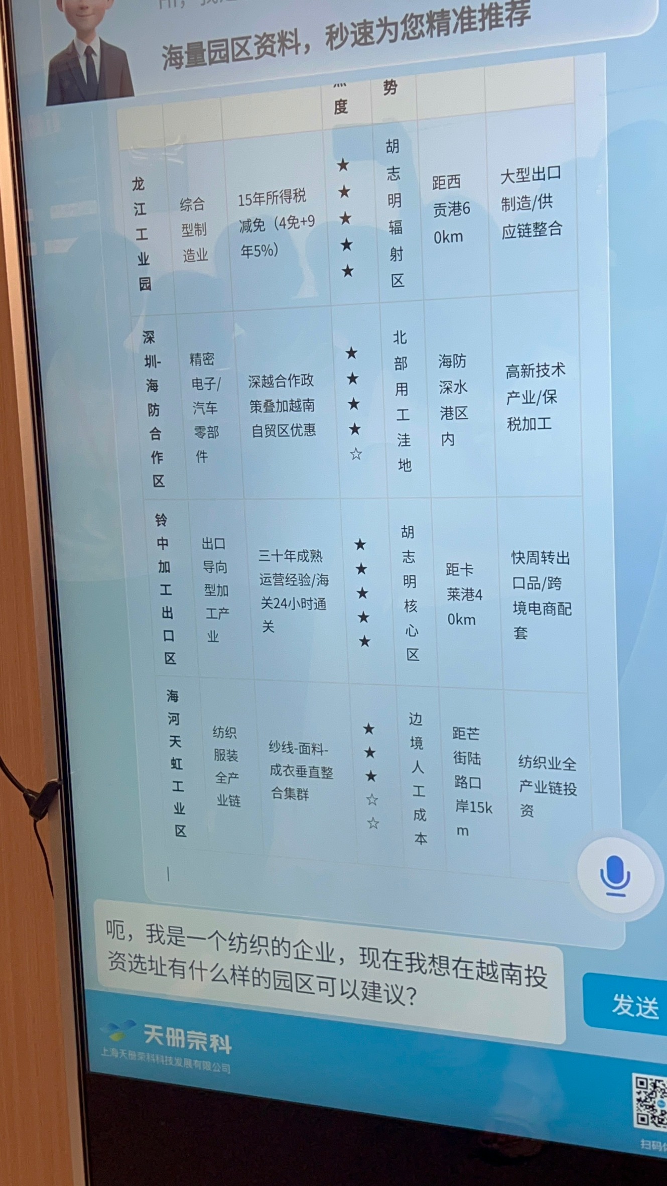 “有国内企业想去东南亚投资却不了解当地园区,只需语音求助,系统立刻推荐最优方案。”王萍说。